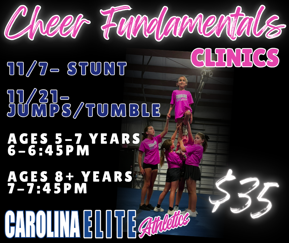 Want to learn the basics of cheer without a huge commitment?! Come to our beginner cheer fundamentals clinic! Ages 8 and up!