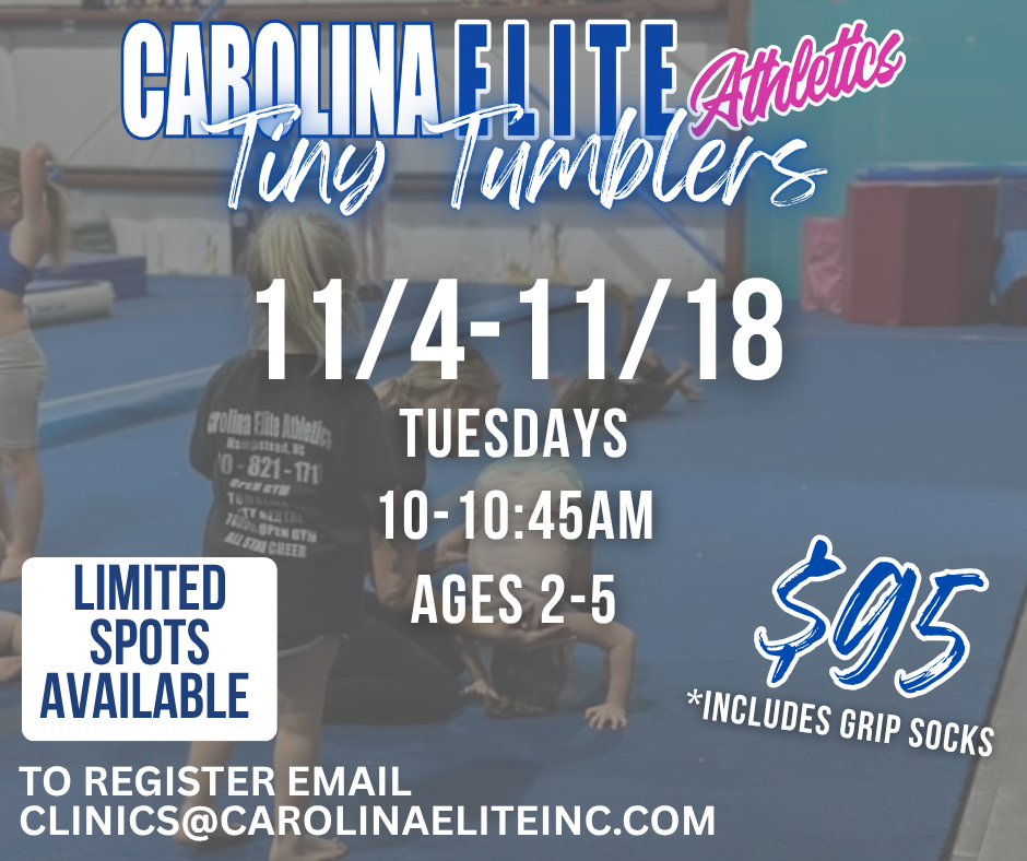 Tiny Tumblers are for ages 2-5 working on class dynamics and following directions and the beginner basics of tumbling. Forward Roll, Backbend, balance, jumping one foot and two feet, controlling their bodies and still having fun. Register HERE