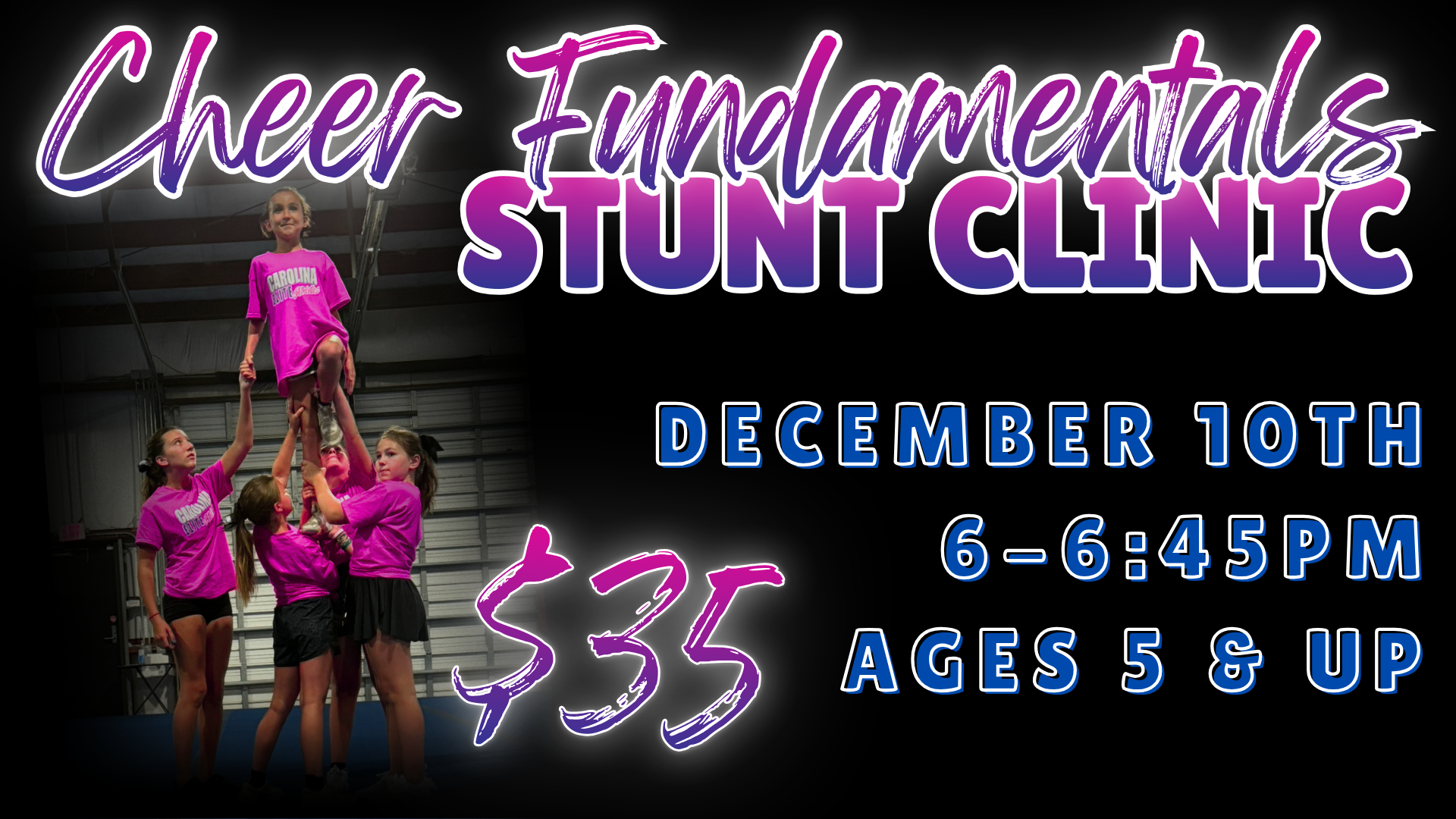 Cheer fundamentals stunt clinic is perfect for an athlete wanting to try out cheerleading without the huge commitment! Register HERE