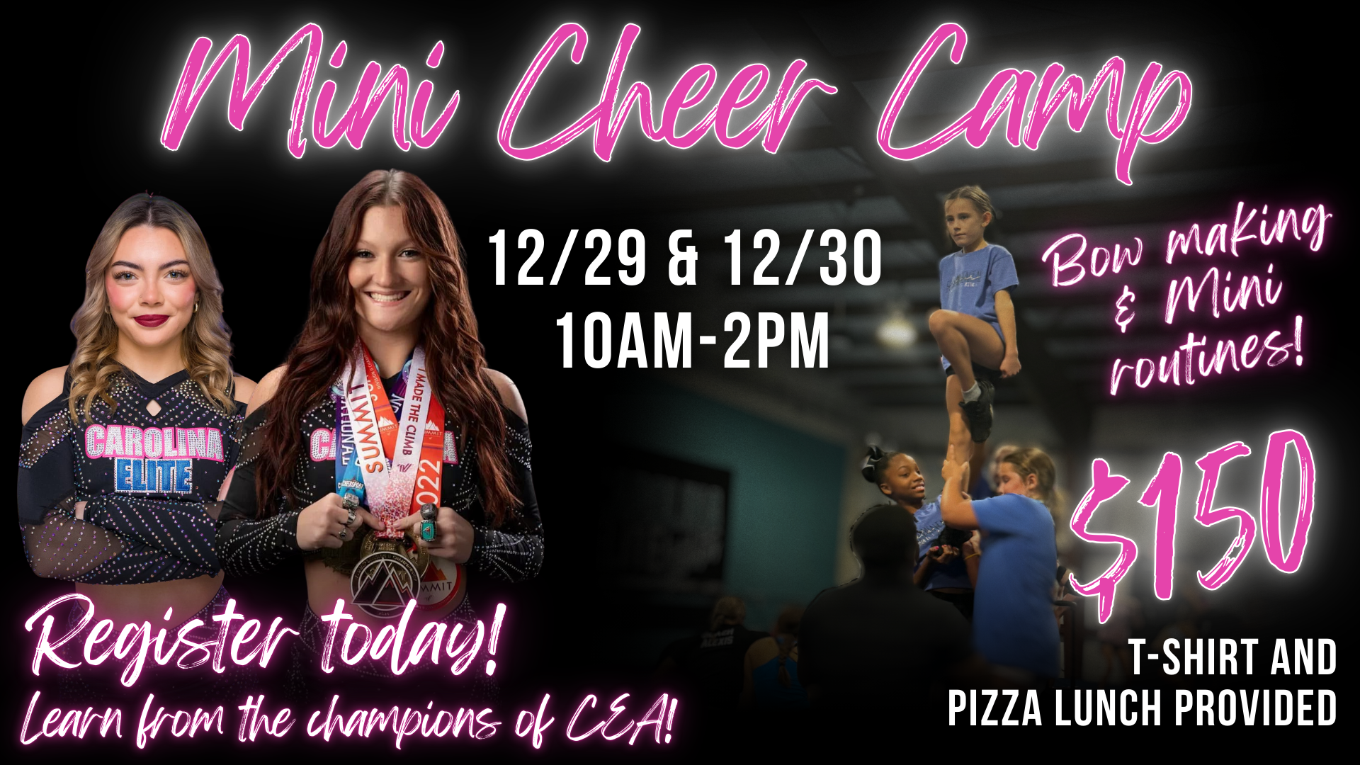 Join us for this two-day mini cheer camp that will include learning a routine and making your very own bow! 12/29 & 12/30 10am-2pm $150 per member Register HERE