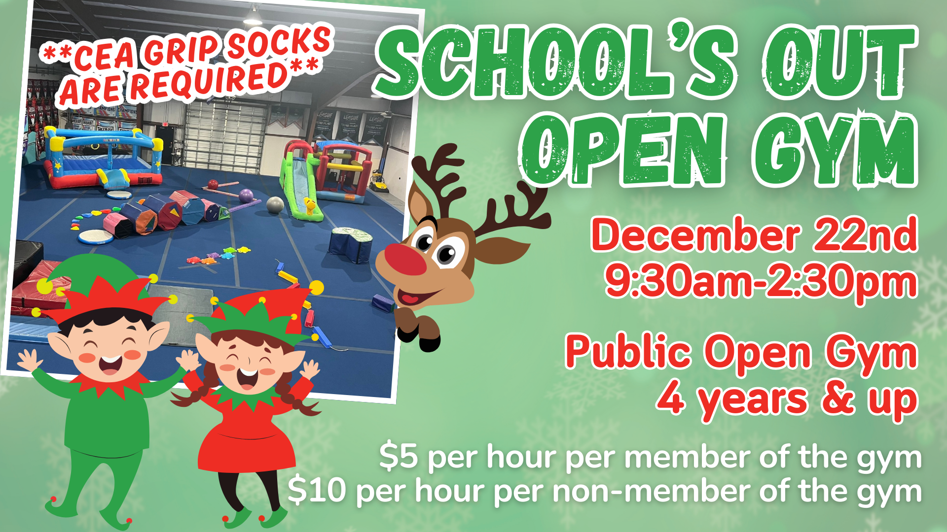 Schools out open gym is great for last minute holiday shopping! $5 per hour for members of the gym $10 per hour for non-members of the gym