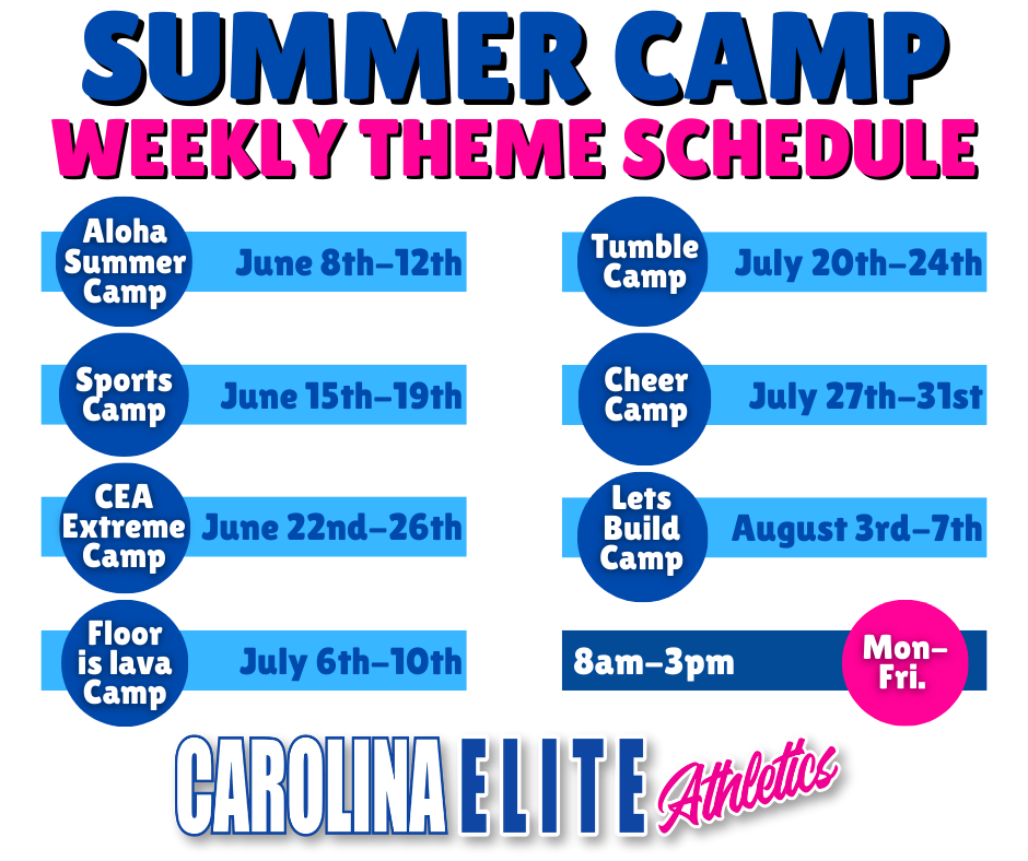 When registering for this event, please fill the registration out, and put what camp you are registering for in the "additional information" section! Day: Monday- Friday Time: 8am-3pm Theme: Aloha Summertime Price: $200 Late pick up available for addition fee! Email for more information! Clinics@carolinaeliteinc.com